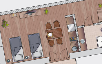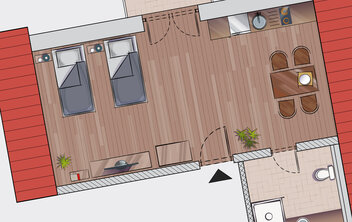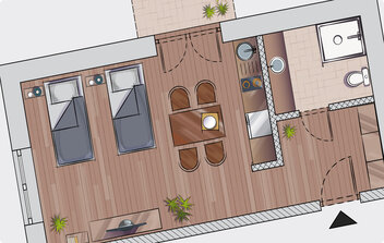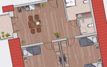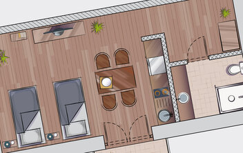 Dabei war uns ein freundliches, wohnliches Ambiente besonders wichtig. Bei der Auswahl der Böden, der Gardinen und der Wandgestaltung haben wir besonders auf modernen Anspruch gesetzt. Bequeme Betten und Schränke wurden von einem Hotelausstatter und Schreiner speziell für uns gefertigt. Die Badezimmer bieten viel Platz, bodengleiche Duschen und Föhn sorgen für komplettes Wohlfühlerlebnis. Die Einbauküche – ebenfalls eine massive Schreinerarbeit – bietet moderne Optik und Komfort. Dank Geschirrspüler, Kaffeemaschine, Kühlschrank und Mikrowelle ist ab dem ersten Tag die Selbstversorgung gesichert!